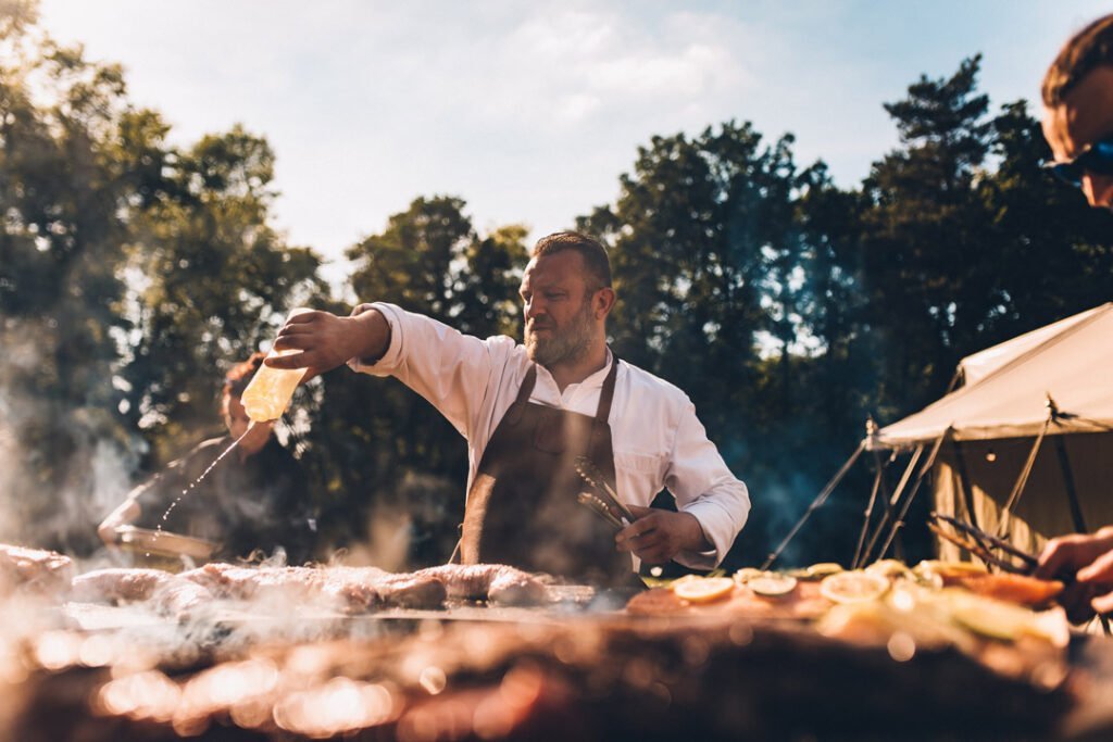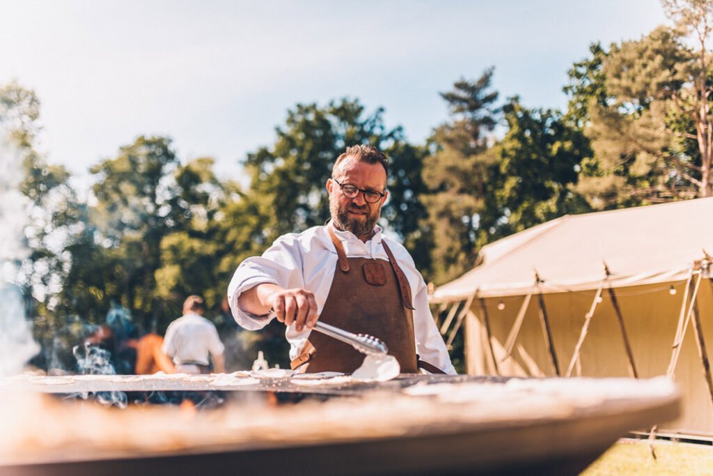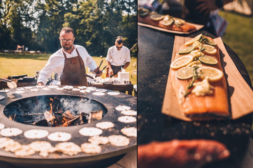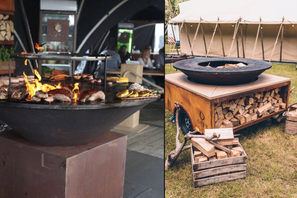 Dieses Modell ist speziell für das Catering und das Kochen für große Gruppen gedacht. Mit einem Durchmesser von 150 cm bietet er genügend Platz für zwei Köche, die gleichzeitig arbeiten und dabei circa 150 Leute beköstigen können. Und dazu gibt es natürlich noch zahlreiche Accessoires für die Eventküche: Auf dem mittigen Grillrost können Sie in Pfannen, Töpfen oder Woks direkt über dem Feuer auch andere Speisen zubereiten wie z.B. feuriges Gulasch, würzige Paella, gesunde Gemüseeintöpfe, wärmende Suppen oder Glühwein – auch Süßspeisen wie Kaiserschmarrn und vieles andere mehr sind möglich. Die Kochplatte des OFYR bleibt dabei unversperrt. Dadurch können Sie gleichzeitig andere Gerichte kochen.